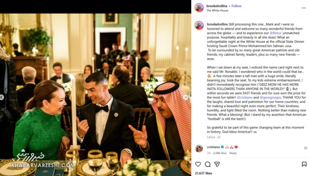 پس از این دیدار، یکی از نزدیکان ترامپ، بروک رولینز، وزیر کشاورزی آمریکا، فاش کرد که در ابتدا نمی‌دانسته چه کسی در کنار او نشسته است. رولینز در یک پست اینستاگرامی نوشت: «وقتی پشت صندلی‌ام نشستم، روی کارت کنارم نوشته بود «آقای رونالدو». فکر کردم چه کسی می‌تواند باشد؟ چند دقیقه بعد مردی قدبلند با لبخندی بزرگ و پر از شادی در کنارم نشست. می‌دانم فرزندانم از اینکه او را بلافاصله نشناختم شرمنده می‌شوند، اما در عرض چند ثانیه دوست صمیمی شدیم و میز ما بدون شک به شادترین و بهترین میز تبدیل شد.»
